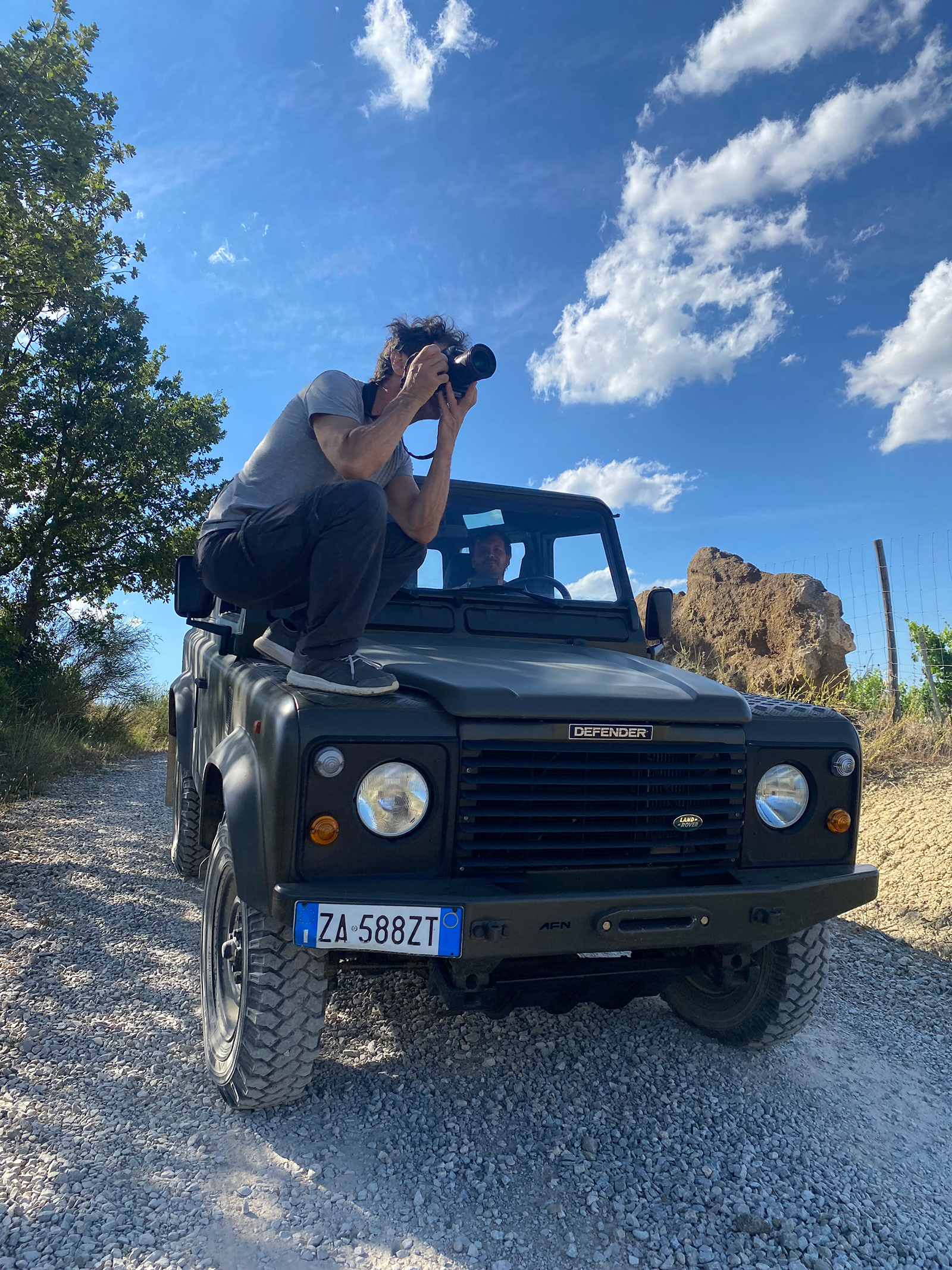 La pausa pranzo è comoda e con i tempi giusti. Abbiamo il tempo anche per spegnerci e risposare un po’. Il pomeriggio ci riserva una bella gita al fiume che attraversa il podere: piedi scalzi e via in acqua a cercare lo scorcio migliore. Il Defender ci riporta al Borgo, è quasi in arrivo l’ora magica. Vogliamo raccontare anche le persone e per questo alle 19:30 arrivano i ragazzi dello staff: c’è un enologo, il giardiniere, il responsabile del wine bar e quella dell’accoglienza. Li aspettiamo con calici colmi di Chardonnay “I Maremmani”: Aldo è bravo a mettere le persone a proprio agio ma io credo che anche il vino aiuti. Loro sono molto sorridenti, funziona tutto alla grande. Chiudiamo il servizio alle 21:05, il mio contapassi segna 9.8 km. Siamo stanchi ma molto contenti, Aldo soprattutto. Che poi mi sfida: “domani 05:30”.