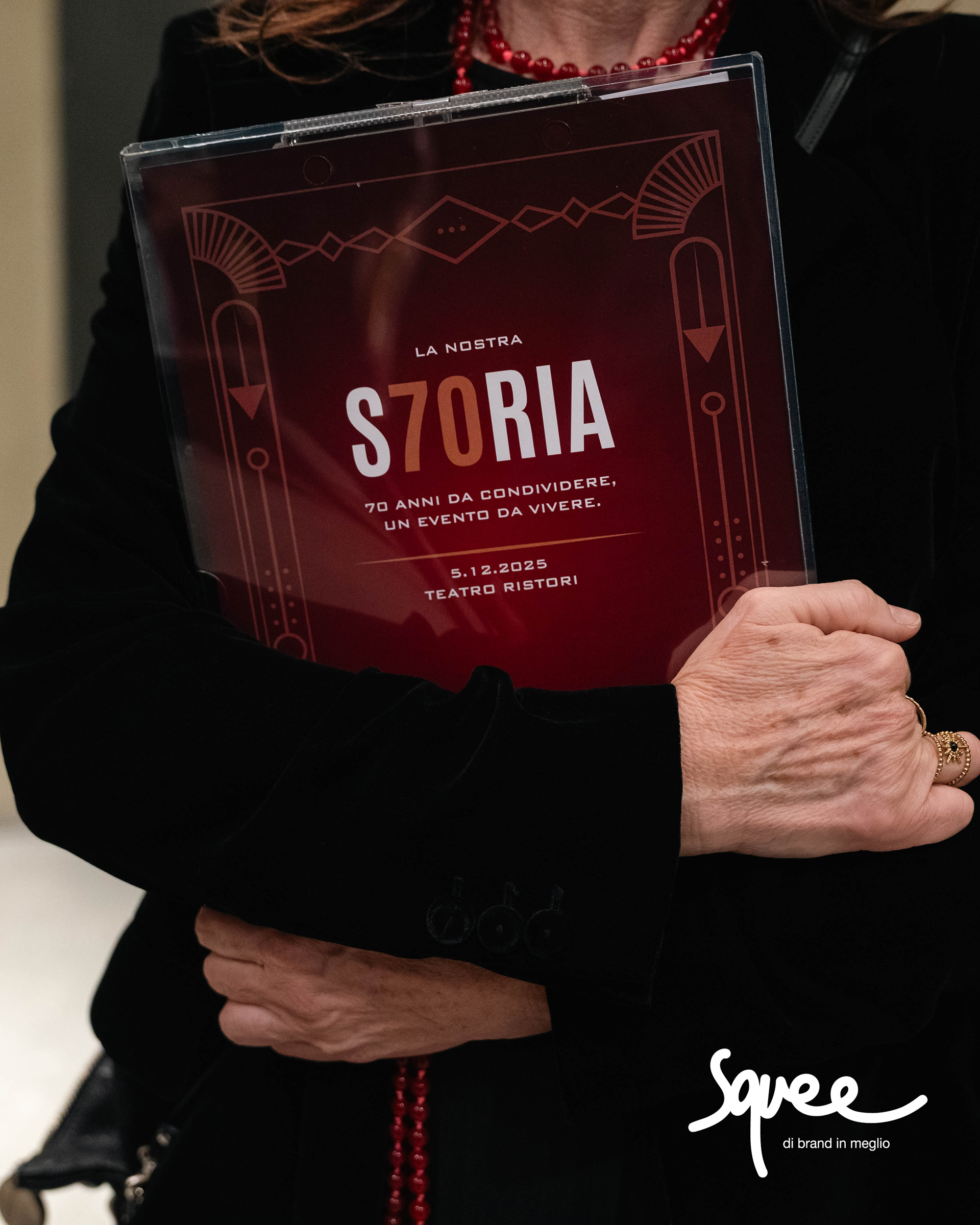 E proprio la "Storia" è diventato il punto di partenza del naming, dove la cifra 70 è stata incastonata: nasce così "La nostra S70RIA." La grafica studiata ha rimandato ad atmosfere raffinate e preziose evocando un "decò" contemporaneo, il tutto arricchito da fondo "rosso velluto". L'immagine è stata coordinata e declinata su inviti, landing page dedicata, menù, locandina, fondale per shooting, shopper e gadget, grafiche proiettate all'esterno e videoproiezioni interne, newsletter e social.